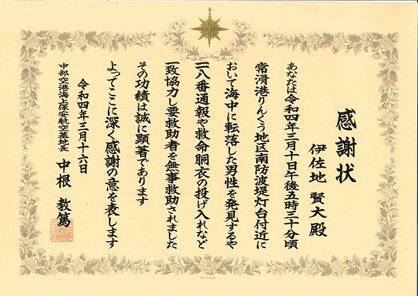 3月10日夕刻、愛知県常滑市の防波堤から海に転落した男性を、周囲の人と協力して救助した当社中部空港支店所属の社員が、3月16日に中部空港海上保安航空基地より感謝状を頂きました。