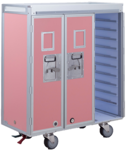 「搬送カート」とは、当社が 長年培った機内食カートの技術を活用し軽量コンパクトかつ機敏性に優れたケータリン グ・保管搬送用のカートで、鉄道輸送の場面でも広くご利用いただいております。